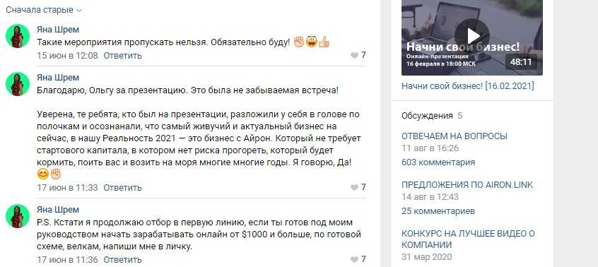 Подозрения также вызывают одни положительные отзывы об Airon network, которые часто публикуются на стене сообщества VK. Проверить правдивость этих комментариев невозможно, как и отследить статистику самой группы, поскольку подписчики могут быть накручены, а негативные комментарии удаляться администрацией.