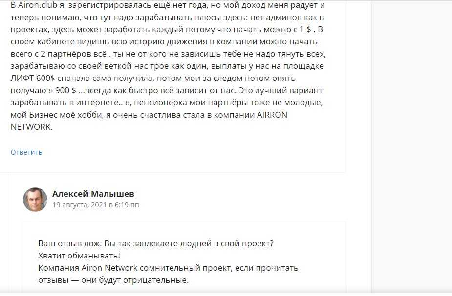 Таким образом, мы можем резюмировать, что Airon network – это обыкновенный проект аферистов, который рассчитан на наивных пользователей.