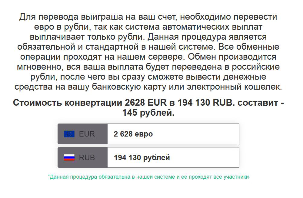 В чем подвох. Это вариант предыдущего развода. Чтобы получить причитающиеся вам средства, нужно заплатить комиссию заграничного банка за перевод денег на ваш счет. Размер этой комиссии незначителен по сравнению с суммой выигрыша: часто она не превышает 0,1%. Поэтому люди платят несколько сотен или даже тысяч рублей в надежде получить полный выигрыш.