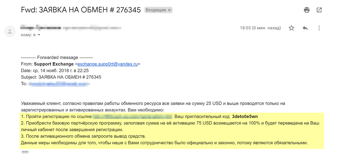 Служба поддержки обменника заявила, что я должен купить партнерскую программу за 75 $, и пообещала после этого вывести средства и вернуть 75 $. Они заметили, что об этом должен был предупредить куратор, а почему не предупредил — их не волнует.