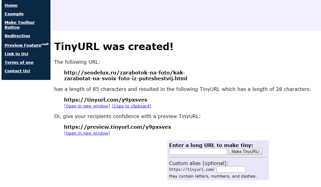 TinyUrl.com — один из первых сервисов-сокращетелей, который за это время набрал довольно-таки солидную армию приверженцев. Правда его текущий внешний вид несколько не соответствует взыскательным требования пользователей, но работает он вполне исправно.