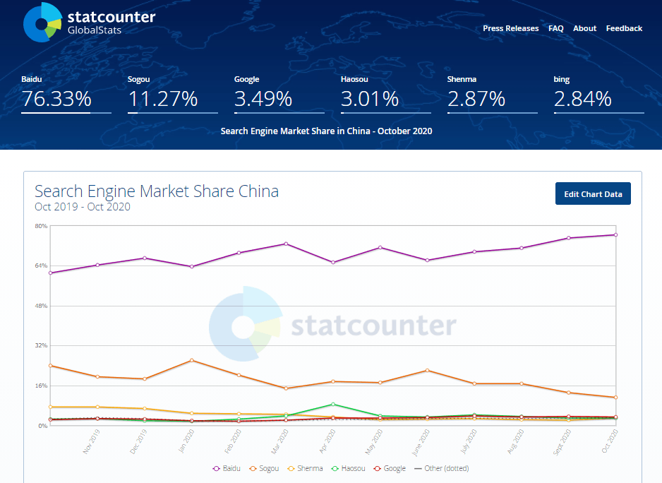 Основной сегмент, который после добровольно-принудительного ухода Google с Китая является доминирующим игроком с долей рынка 76%. Ближайший конкурент — компания Sogou, в которую инвестировали Tencent и Sohu, занимает второе место с долей рынка в 11%.