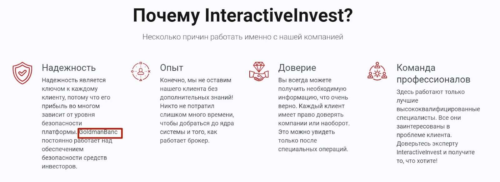 Кроме того, на сайте мы нашли упоминание GoldmanBanc. Несмотря на то, что об этой “кухне” написано множество негативных отзывов, к InteractiveInvest она отношения не имеет. Жулики поленились придумать текст для собственной площадки, просто украв его у другого лохотрона.