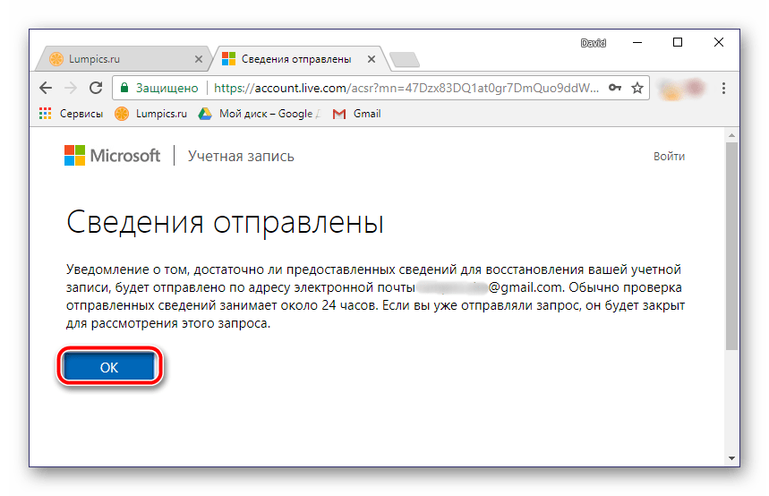 Все указанные вами сведения будут отправлены в службу поддержки Майкрософт на рассмотрение. Теперь остается просто ждать письма на указанный в пункте 3 почтовый ящик, в котором вы узнаете о результате процедуры восстановления.