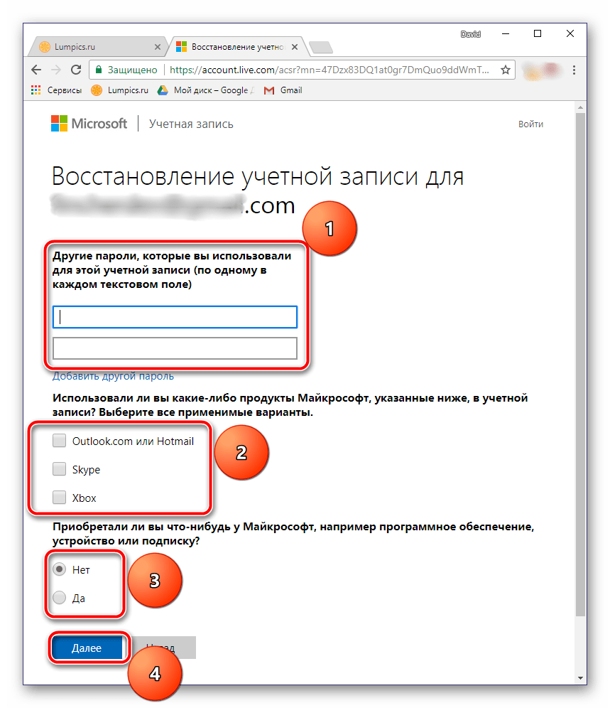 Оказавшись на очередном этапе восстановления, введите последние пароли от почты Outlook, которые вы помните (1). Крайне желательно также отметить другие продукты Microsoft, которыми вы, возможно, пользуетесь (2). Например, указав сведения от учетной записи Skype, вы повысите свои шансы на восстановление пароля от почты. Отметьте в последнем поле (3), приобретали ли вы какие-либо продукты компании, и если да, укажите что именно. После этого нажимайте по кнопке «Далее».