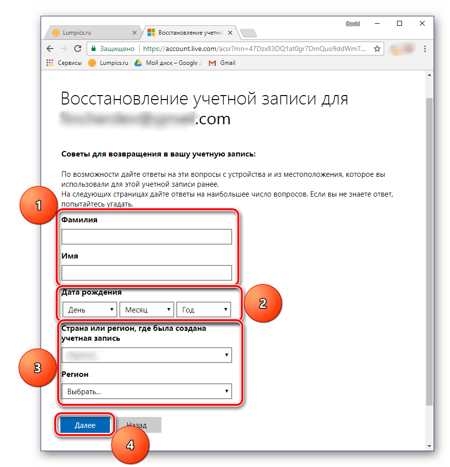 К сожалению, это еще далеко не все. На следующей странице для восстановления доступа к учетной записи потребуется ввести указанные при регистрации сведения: