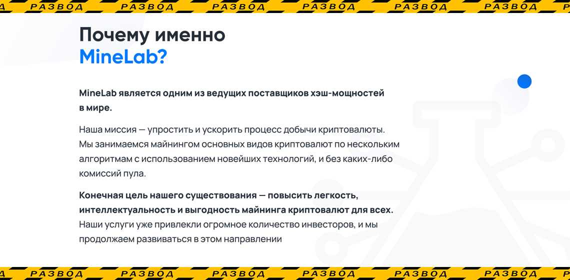 Перейдем к презентации, благо она на русском. Там проскакивает информация, что MineLab является одним из ведущих поставщиков хэш-мощностей в мире. Сильное заявление для компании с двумя языками на сайте! Авторитетные сайты по теме должны знать о такой компании, и мы решили попытаться найти материалы о ней. Но все наши попытки были тщетны. Если вы думаете, что это всё, то нет. Год основания компании указан 2017-й, но сайт основан в 2021-м. Классика.