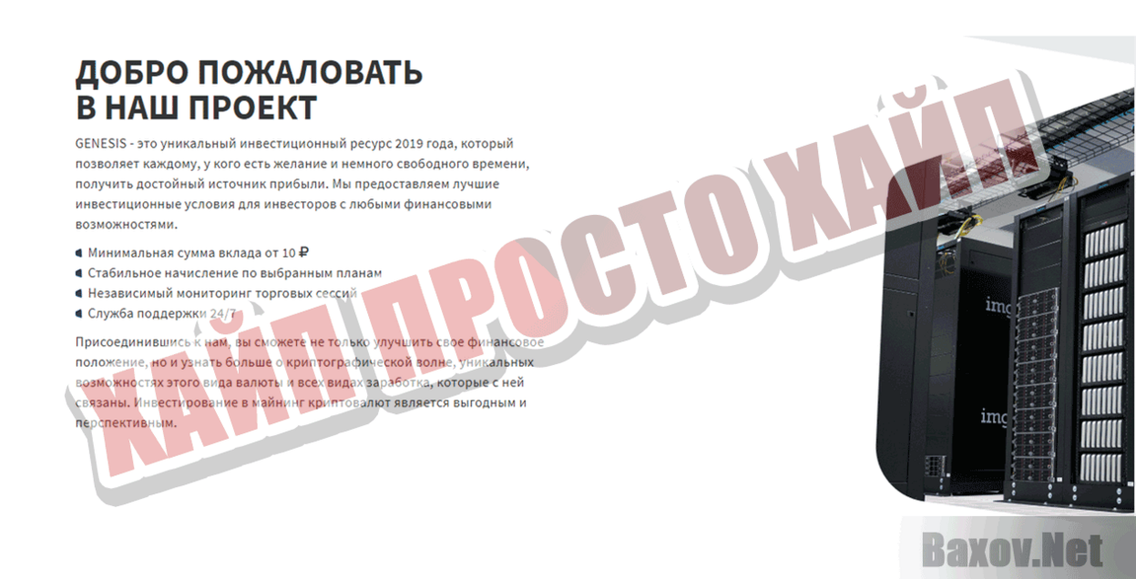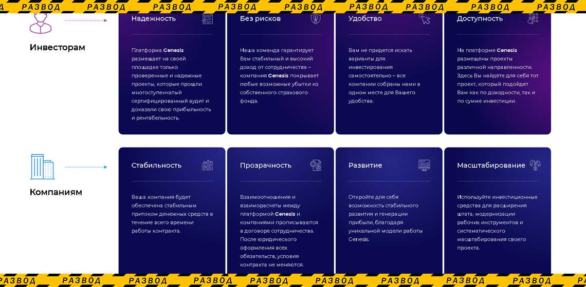 На главной странице размещена легенда, согласно которой Genesis связывает инвесторов, которые желают выгодно инвестировать свой капитал, и компании, готовые делать прибыль из инвестиций вкладчиков.