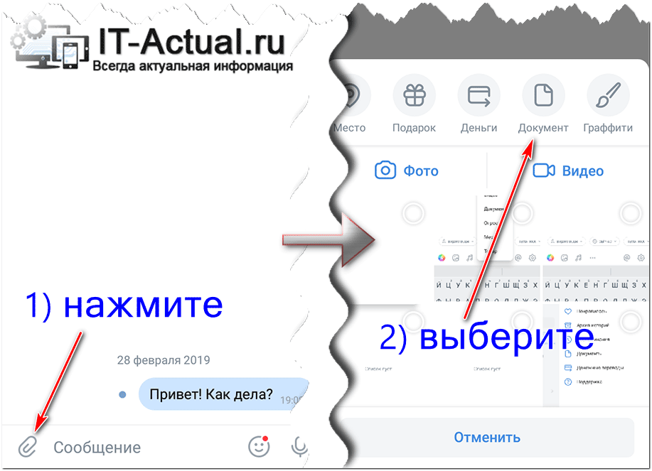 И в приложении ВК следует нажать по скрепке и в открывшемся меню выбрать соответствующий пункт.