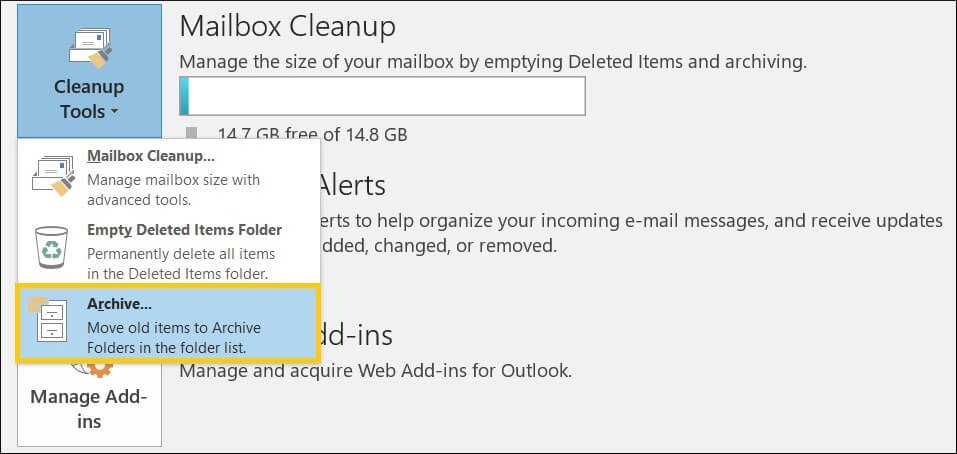 If you do not require consistent backup using AutoArchiving, then you can run the manual archive also. It will perform the same job but with more control. You can go to Info section after clicking File option. Then, choose Cleanup Tools >> Archive.