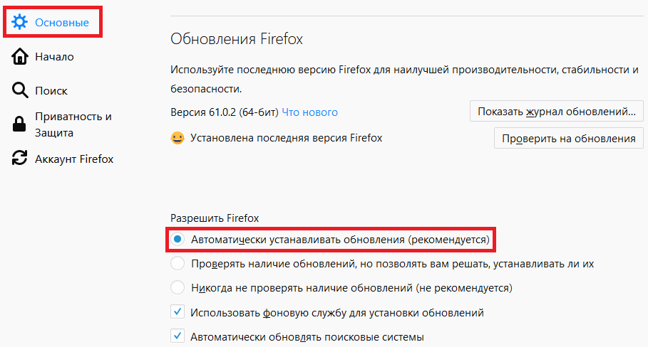 Во вкладке «Основные» прокрутите страницу немного вниз. Убедитесь, что в разделе «Разрешить Firefox», стоит галочка в пункте «Автоматически устанавливать обновления».
