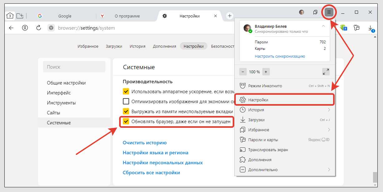 Для того, чтобы обновить Яндекс браузер до последней версии бесплатно, давайте включим режим обновления, даже когда браузер не включен. Для включения данной функции делаем следующие шаги:
