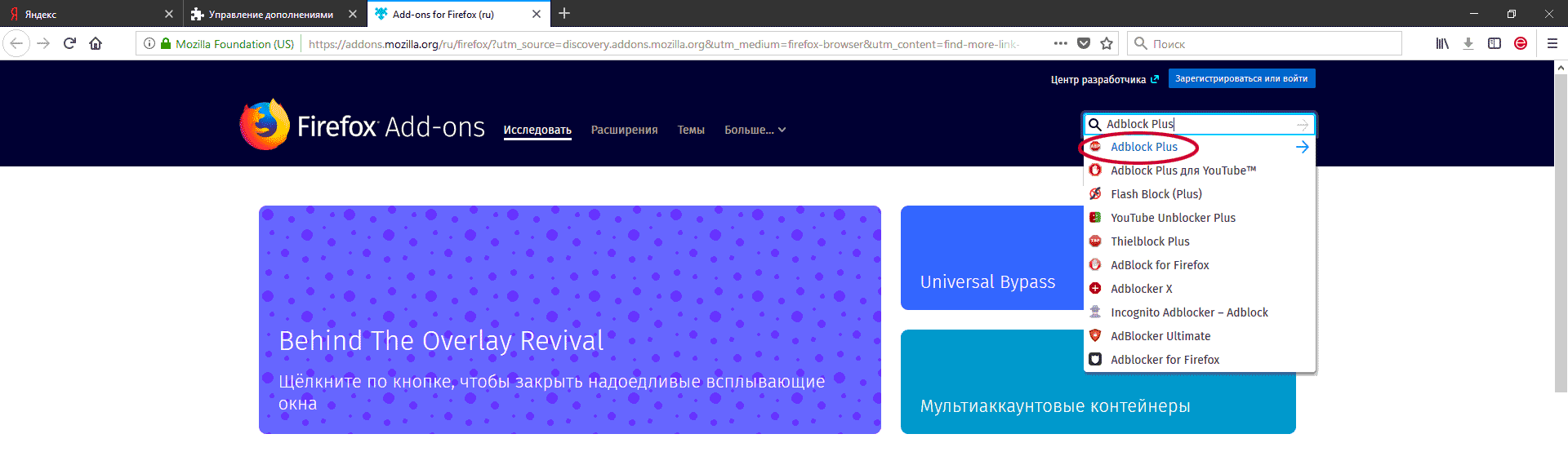 В разделе дополнения необходимо найти AdBlock. Как правило, несмотря на то, что он начинается на букву A, он находится внизу списка. Далее вы можете: