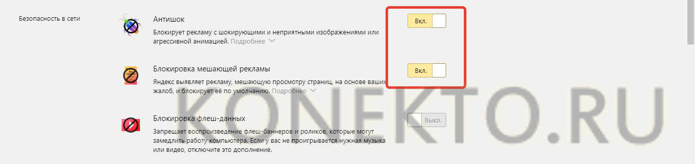 - Переключаем тумблер напротив пункта «Блокировка рекламы».