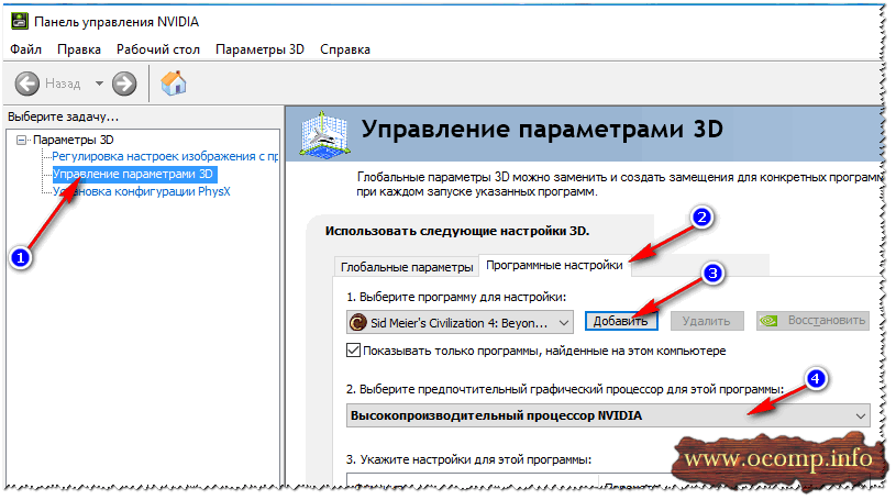 Кстати, в настройках NVIDIA так же можно указать для конкретной игры конкретно используемую видеокарту. Для этого нужно сделать следующее: