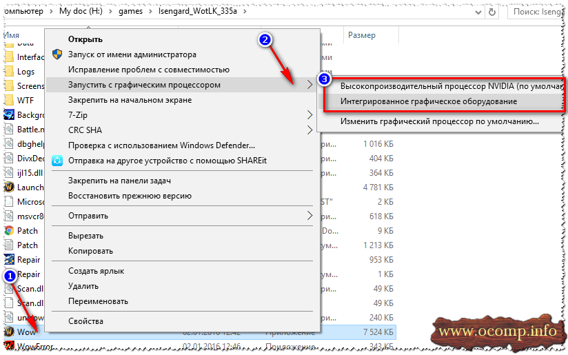 Если вы включили предыдущие пару галочек, то самый очевидный и простой способ запустить игру на нужном видеоадаптере — это открыть проводник, то бишь нужную папку, в которой лежит исполняемый файл с игрой, и нажать по файлу игры правой кнопкой мышки (кстати, можно это сделать и по значку на рабочем столе).