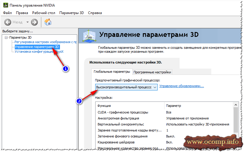 Затем слева выберите «Управление параметрами 3D». В основном окне на вкладке «Глобальные параметры» укажите «Предпочитаемый графический процессор».