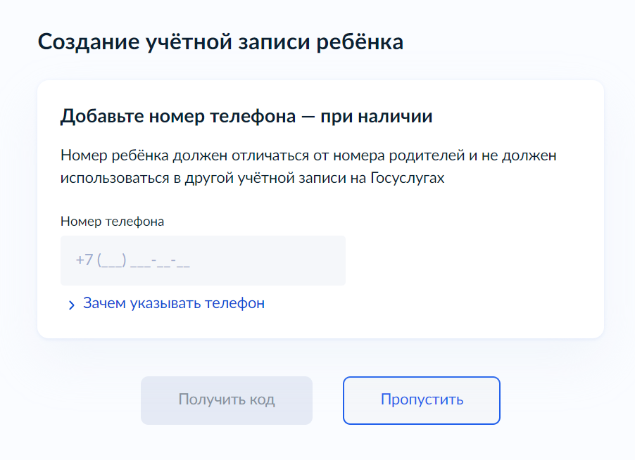 5. Ввести номер телефона ребенка, так чтобы он не совпадал с родительским и не участвовал в регистрации других учеток на «Госуслугах».