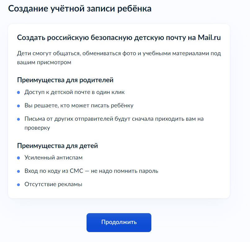 6. Также можно сразу создать детскую почту на Mail.ru. После подписания документов по обработке персональных данных и пользовательского соглашения и выбора из предложенных или своего адреса детской электронной почты, будет создана стандартная учетная запись.