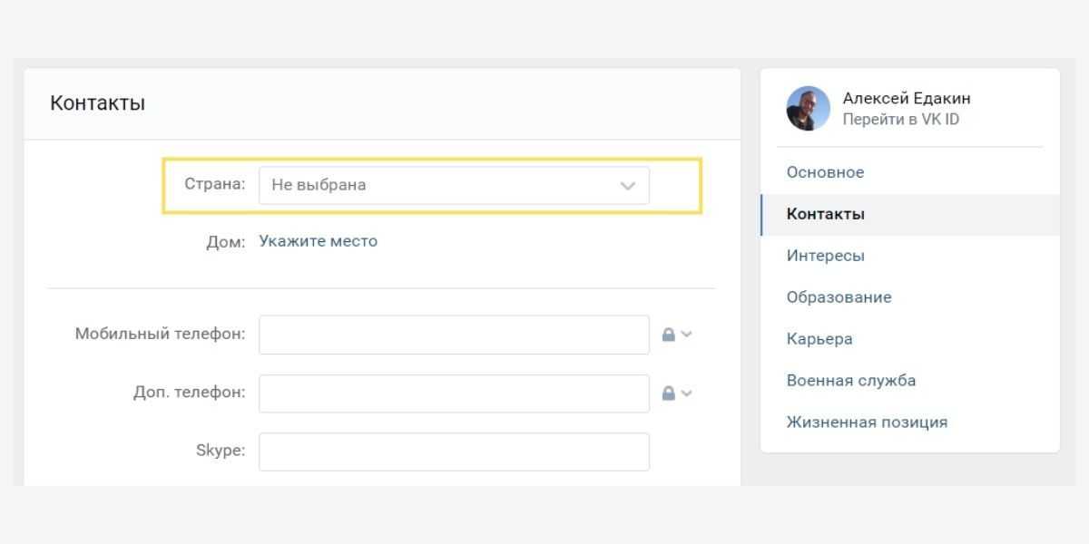 Если не хотите, чтобы на закрытой странице отображались место работы и город, эти данные придется удалить – скрыть их не получится. Для этого перейдите в раздел «Контакты», найдите блок «Страна» и выберите пункт «Не выбрана».