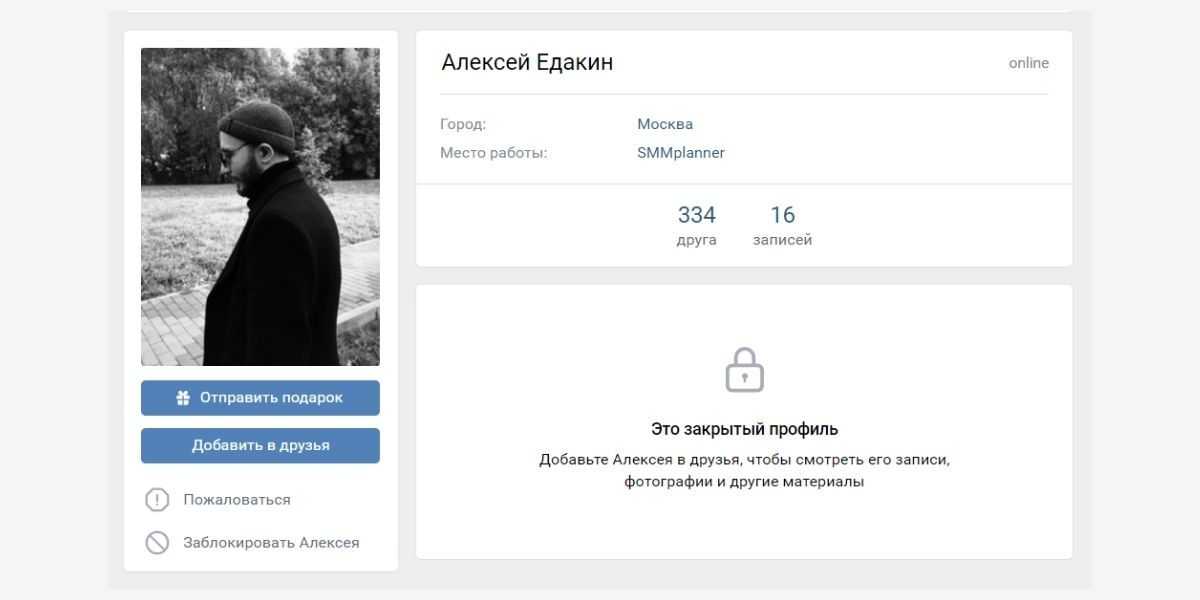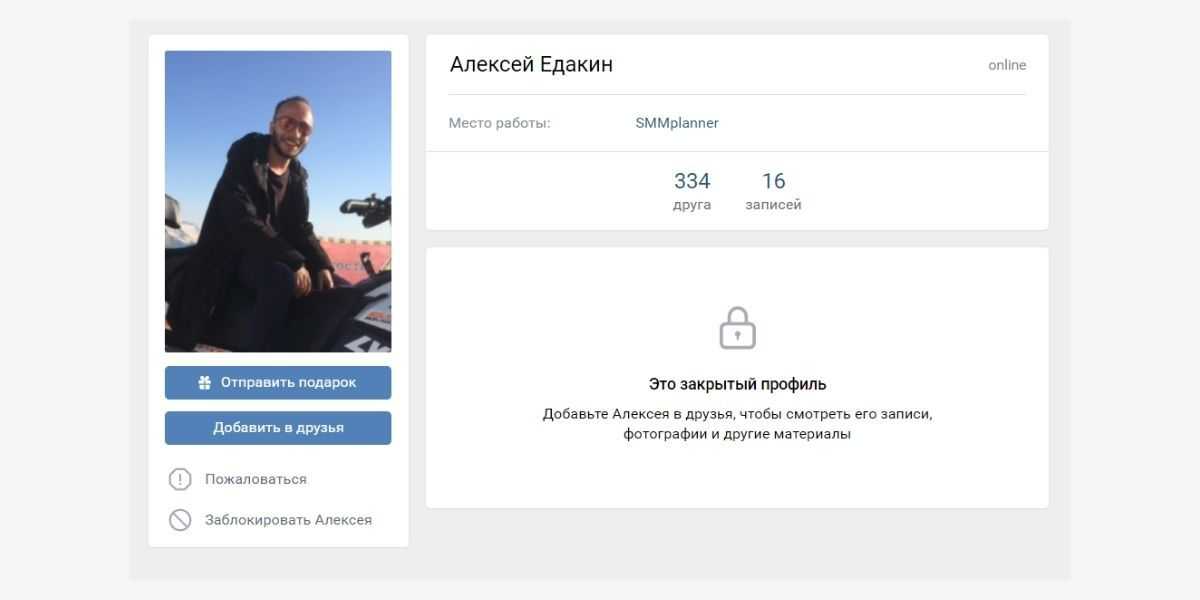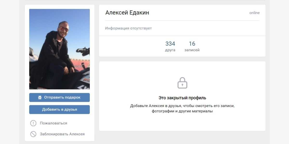 Если владелец профиля указал дату рождения, родной город, место учебы или работы, это тоже будет видно на странице закрытого профиля. Но увидеть, с кем пользователь дружит, посмотреть его фотографии и видео, прочесть записи на стене будет нельзя.
