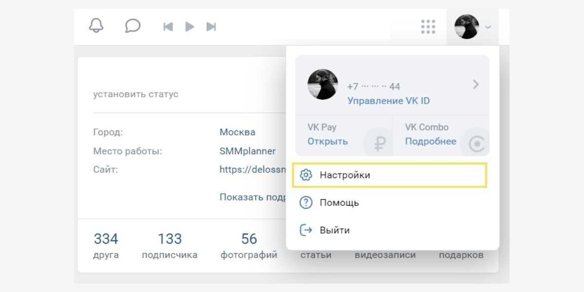 Зайдите во ВКонтакте и откройте VK ID. Для этого выберите кнопку с вашей аватаркой в правом углу. Нас интересует пункт «Настройки».