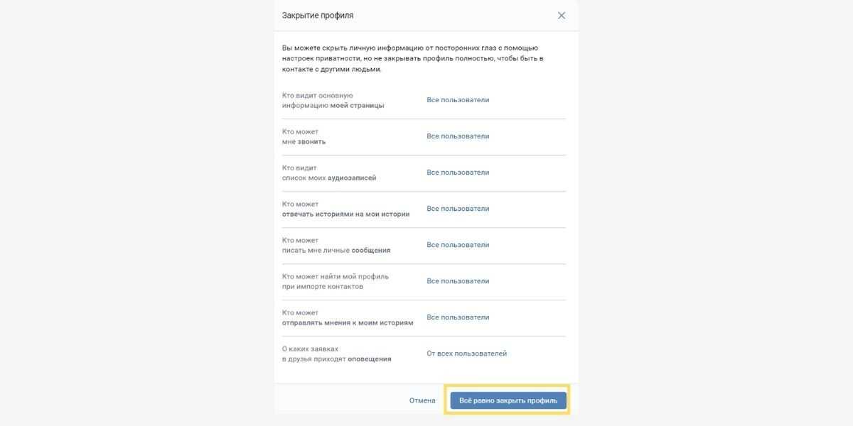 Подтвердите закрытие профиля. Нажимаем «Все равно закрыть профиль». Готово, вы получили закрытый профиль в ВК.