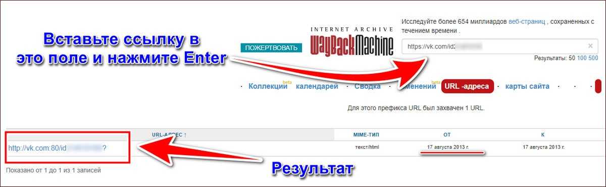 Как показывает практика, искать в российском сервисе бесполезно. Поэтому и время на него тратить не стоит, а лучше сразу прибегнуть к услугам Wayback Machine. Чтобы им воспользоваться, скопируйте ссылку на интересующий профиль и вставьте в специальное поле на сайте сервиса.