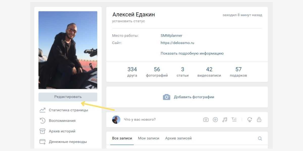 Зайдите на главную страницу профиля и выберите «Редактировать» под аватаркой.