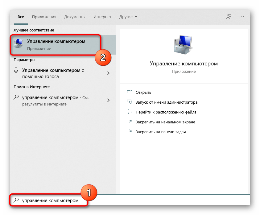 - Для этого отыщите приложение «Управление компьютером» через поиск в «Пуск» и запустите его.
