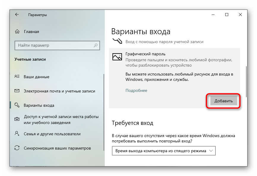 - В этом же меню «Варианты входа», которое находится в «Параметры», выберите пункт «Графический пароль».