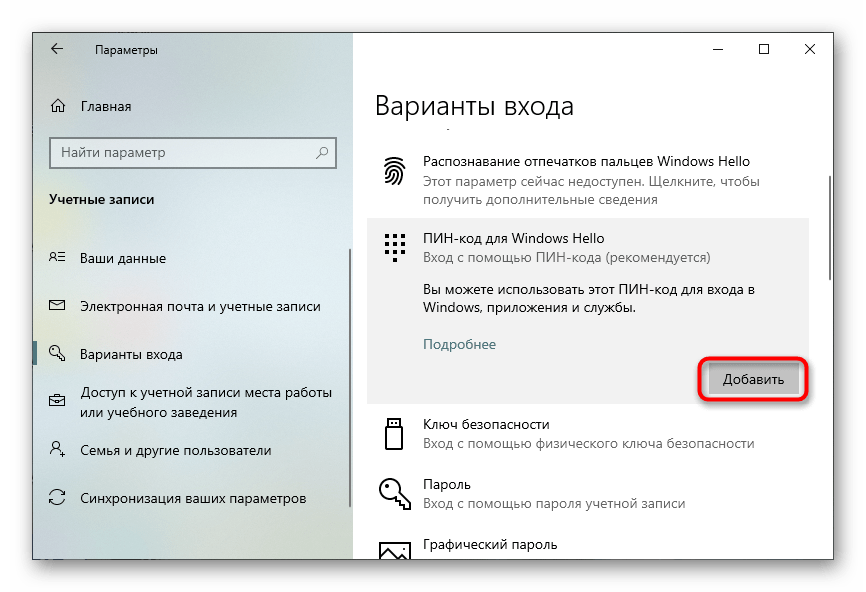 Находясь в приложении «Параметры», откроем раздел «Параметры входа», выберем нужный вид пароля и нажмем «Добавить».