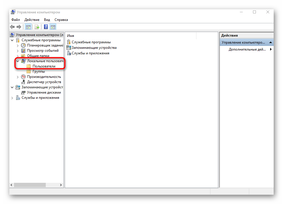 Откройте раздел «Локальные пользователи» и выделите папку «Пользователи».