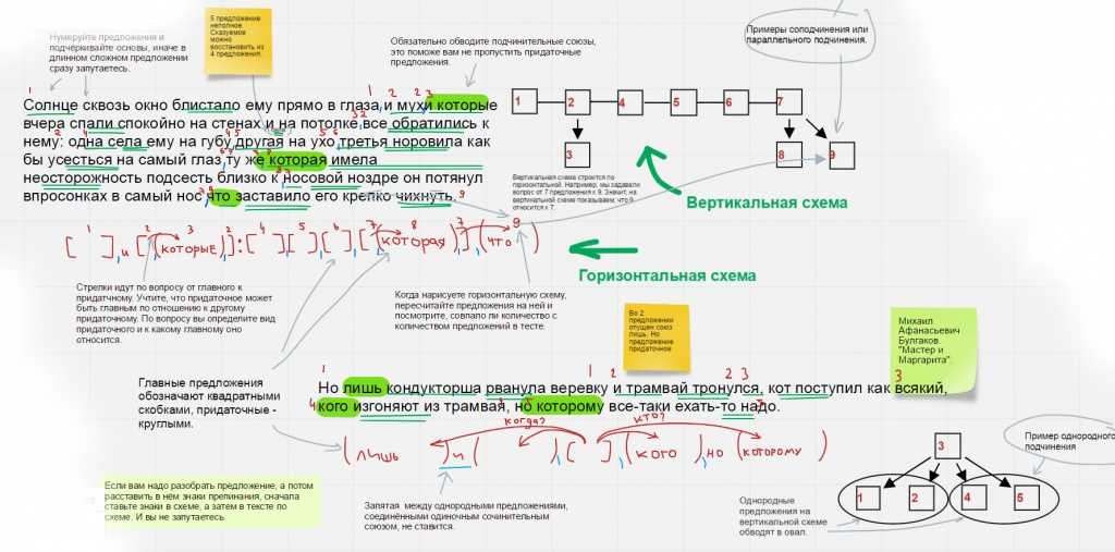 Если в сложноподчиненном предложении более двух придаточных частей, то подчинение в тем может быть либо последовательным, либо однородным. Отразить характер подчинения с помощью обычной горизонтальной схемы можно только при условии использования стрелок, так что в случаях, когда требуется большая наглядность, обычно используют вертикальную схему. Однако без необходимости используется и обычная горизонтальная схема.