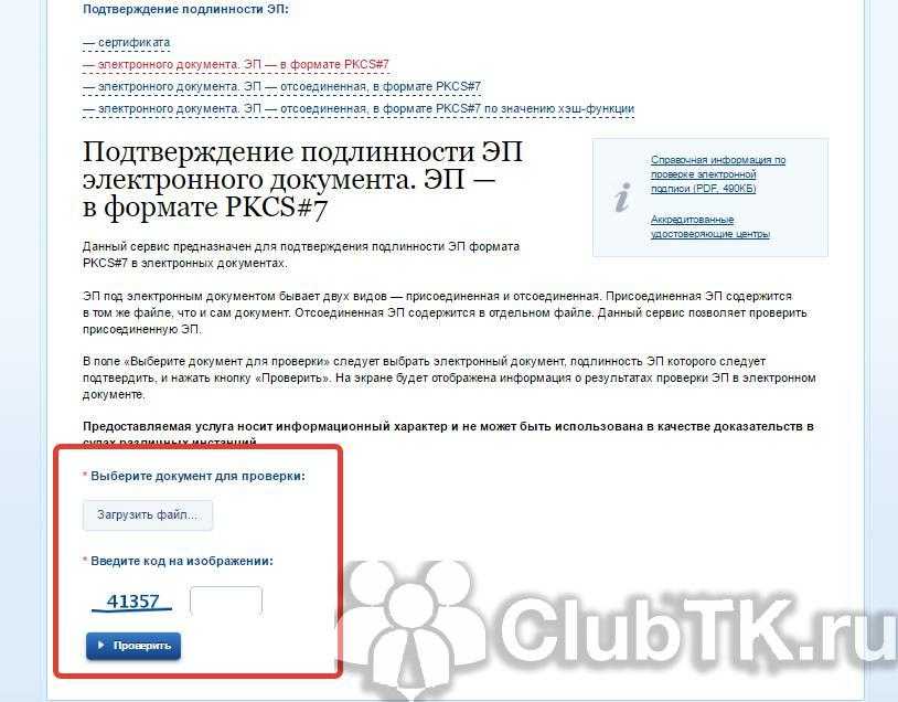 Чтобы установить подлинность присоединенной подписи, необходимо «Загрузить файл», ввести защитный код (капча) и нажать «Проверить».