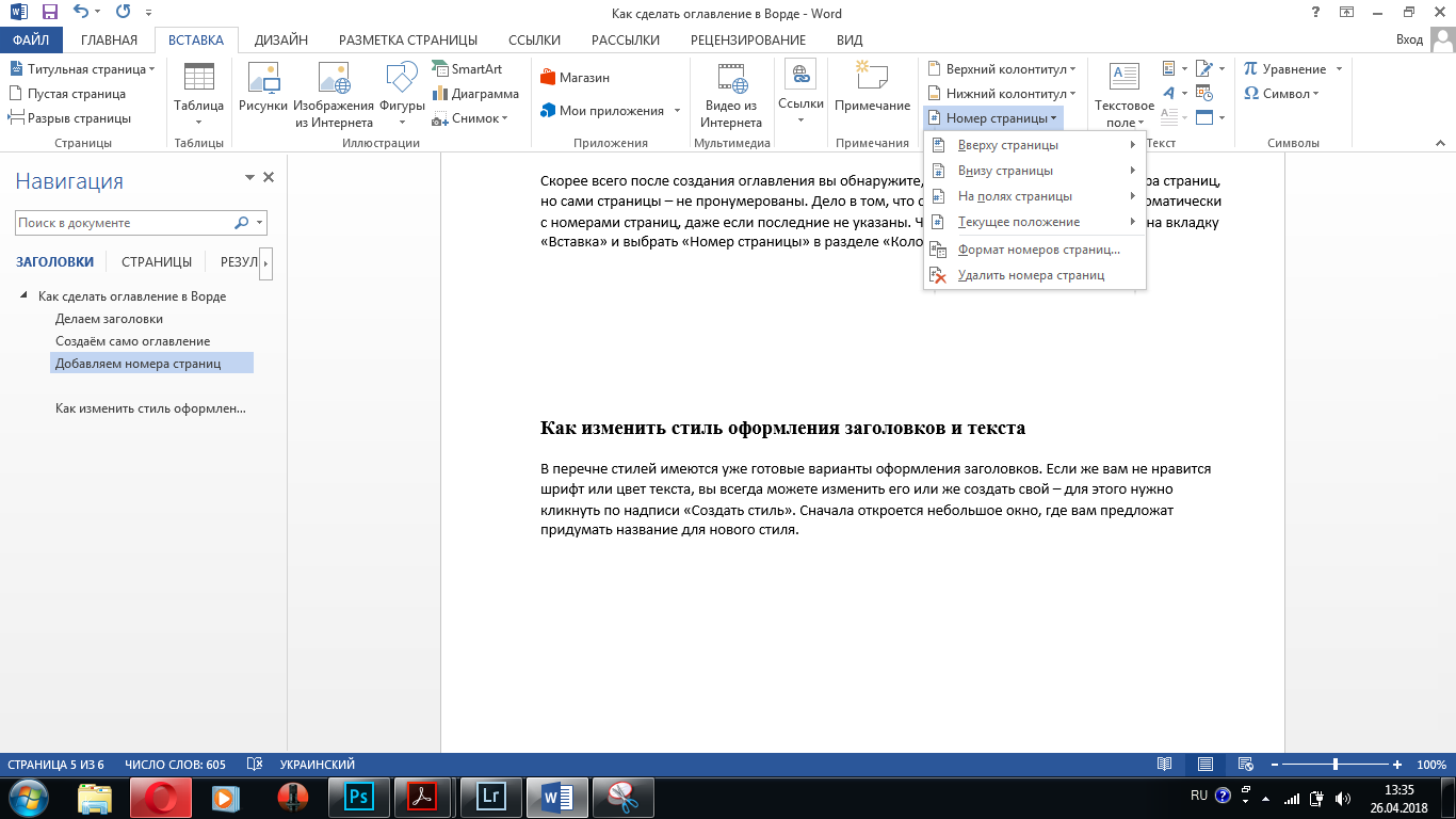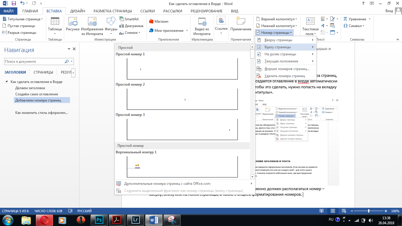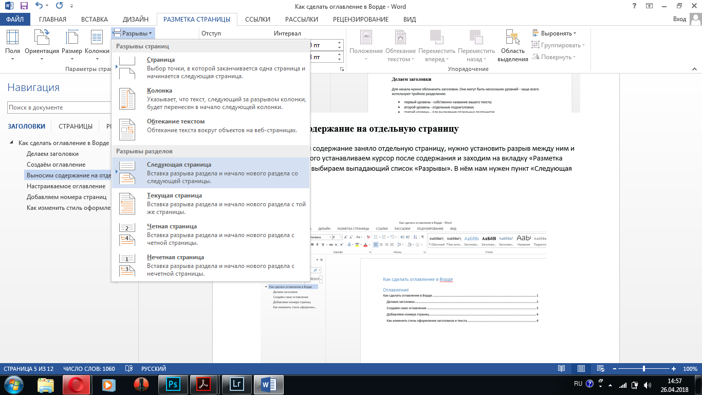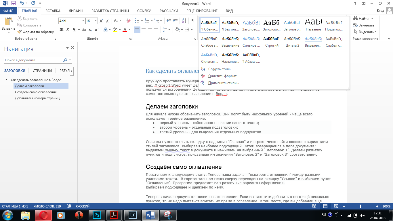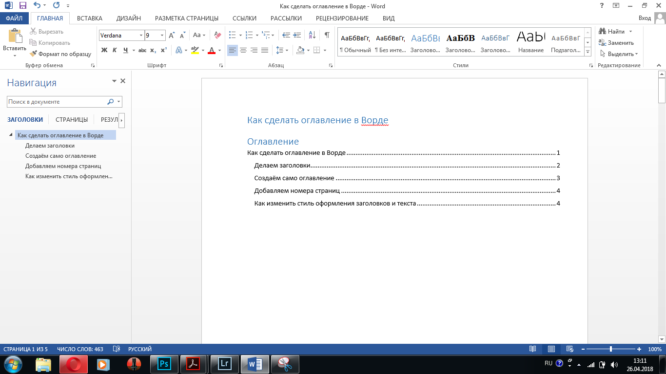Подготовительные работы проделаны, поэтому приступим к созданию автоматического оглавления.