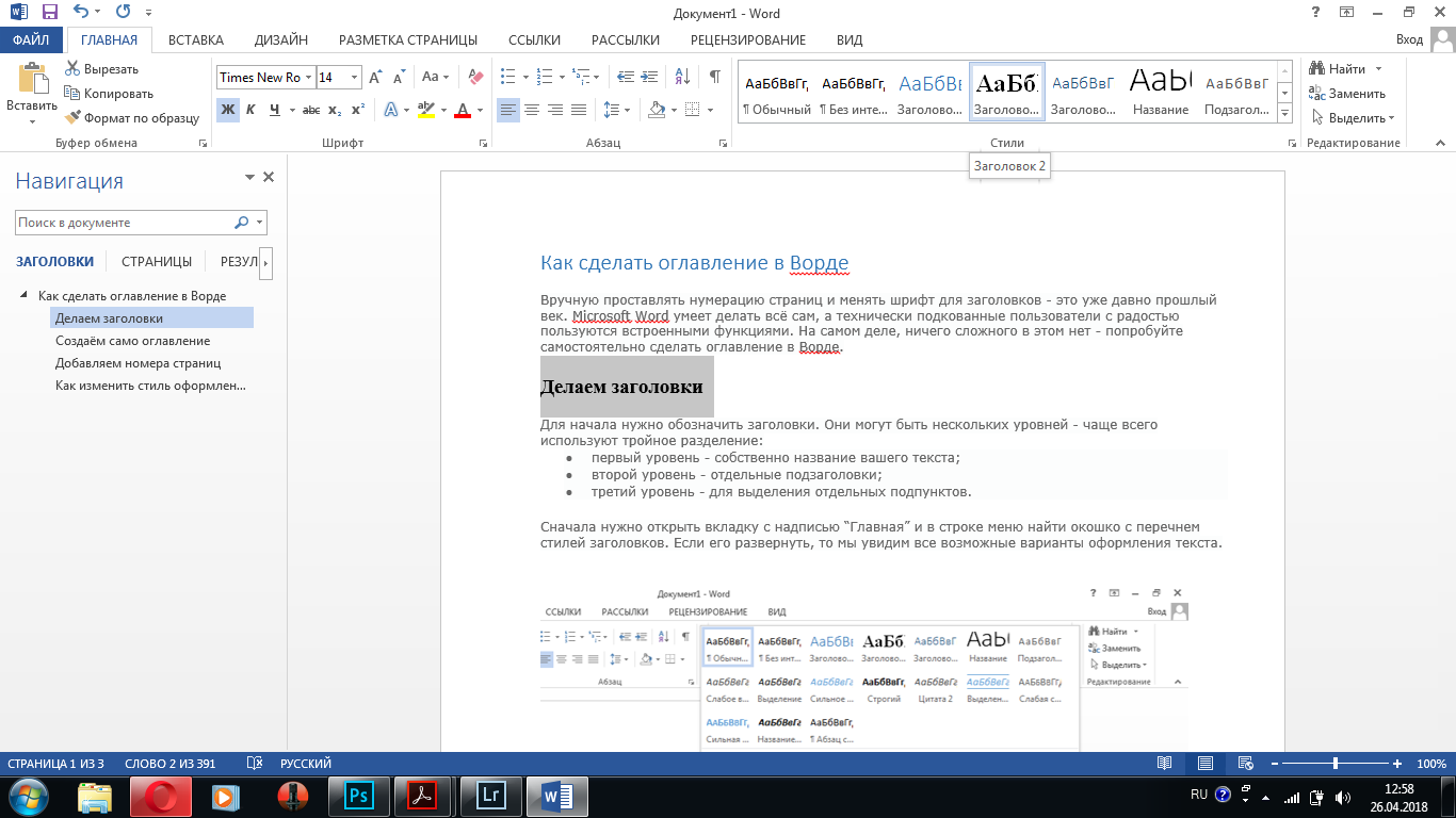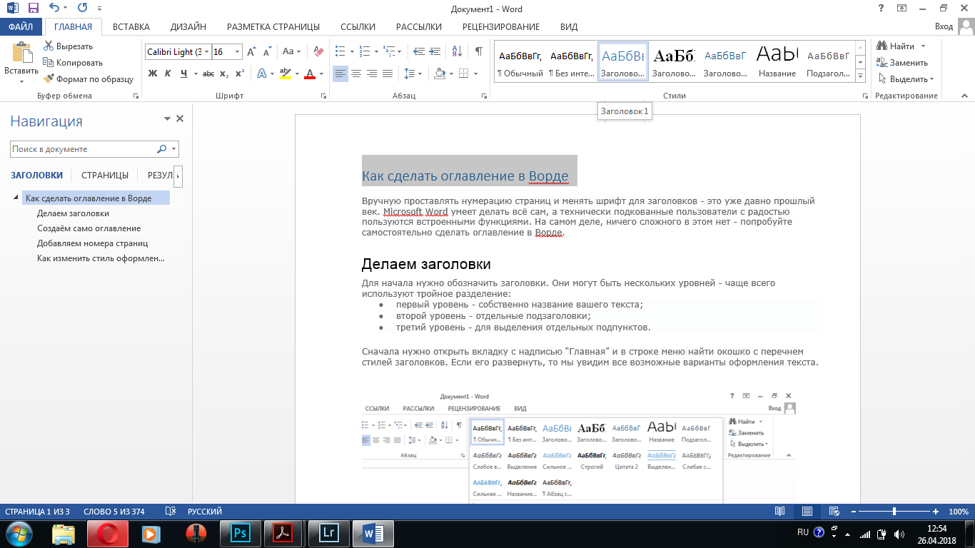 После того, как вы добавили в текст заголовки и подзаголовки, можно приступить к процессу добавления оглавления в документ.
