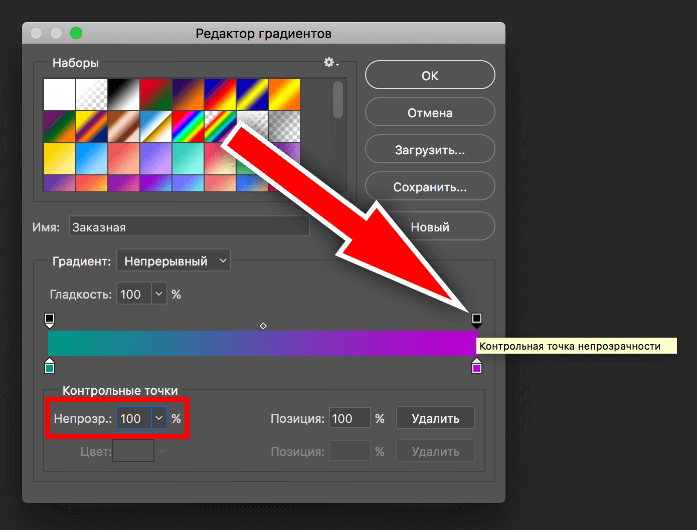 Чтобы переход был именно цветовым, а не прозрачным, нужно задать настройки еще и для контрольной точки непрозрачности (см. скриншот ниже):