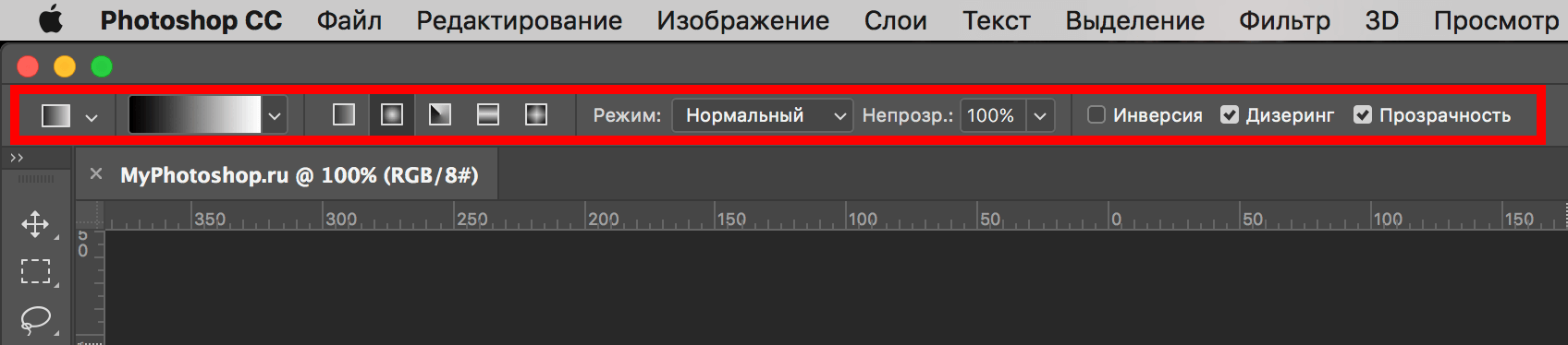 После того, как инструмент выбран, под главным меню появится панель настроек Градиента, где вы сможете выбрать шаблон градиента и установить дополнительные параметры по своему желанию.