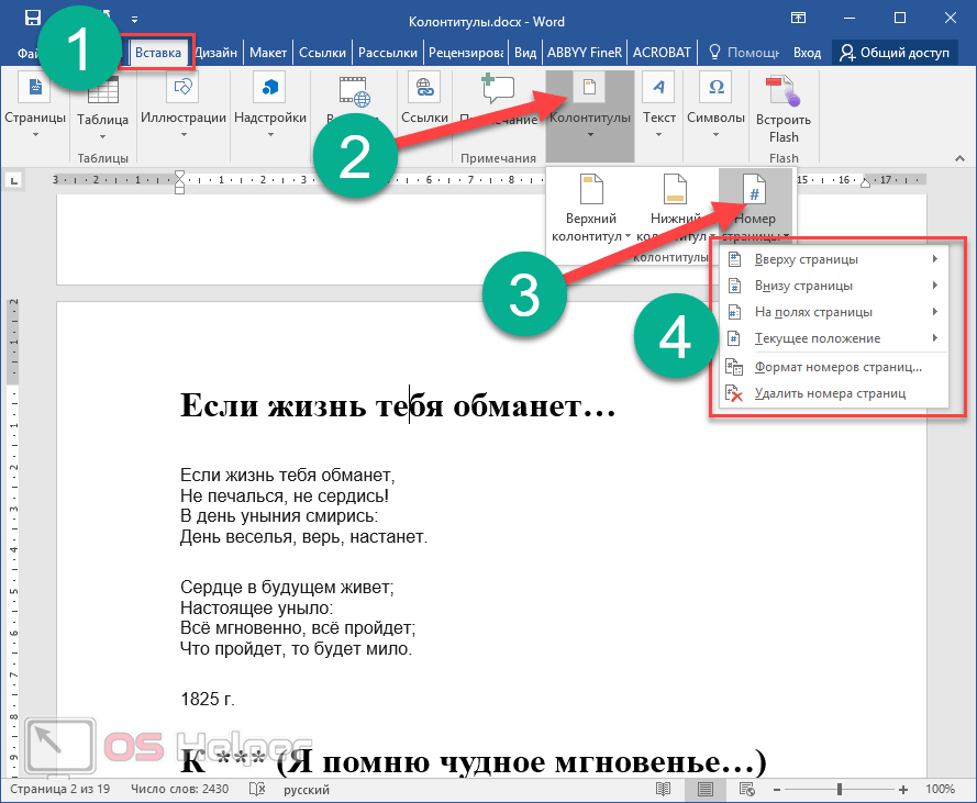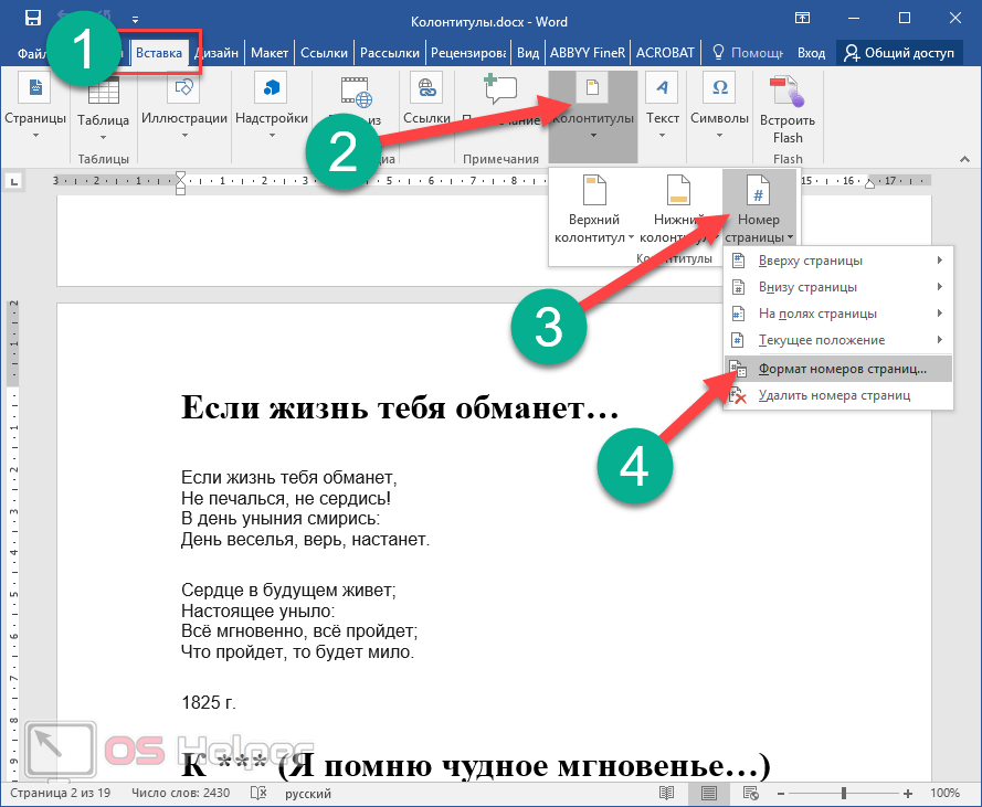 1. Переходим к пункту «Вид» в горизонтальном меню, кликаем по нему единожды; 2. В выпадающем меню выбираем подпункт «Колонтитулы»;