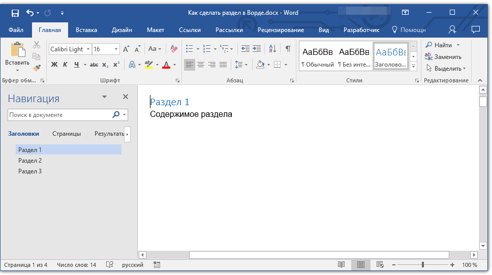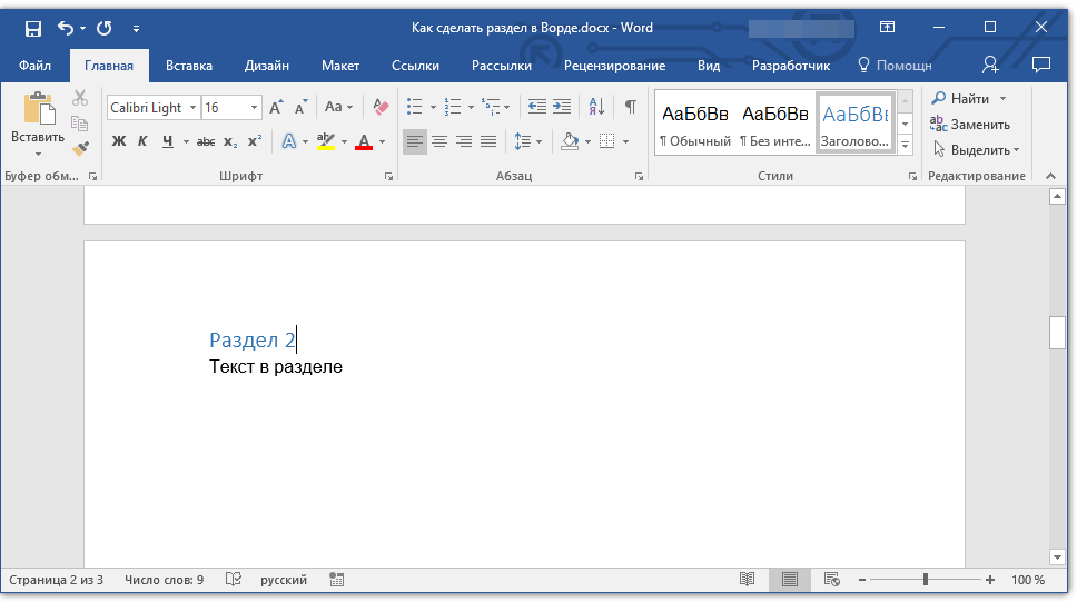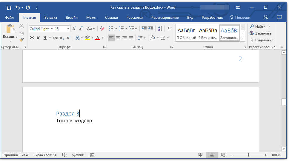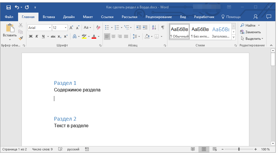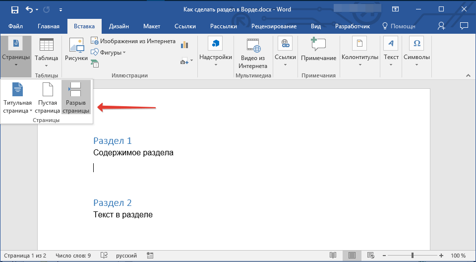 Как было сказано в начале статьи, создать раздел в документе не сложно. Для этого нужно добавить разрыв страницы, а затем выполнить еще несколько простых манипуляций.