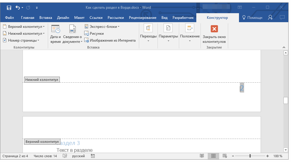 Если вы все сделали верно, то вверху будет написано что-то вроде Нижний колонтитул -Раздел 2-