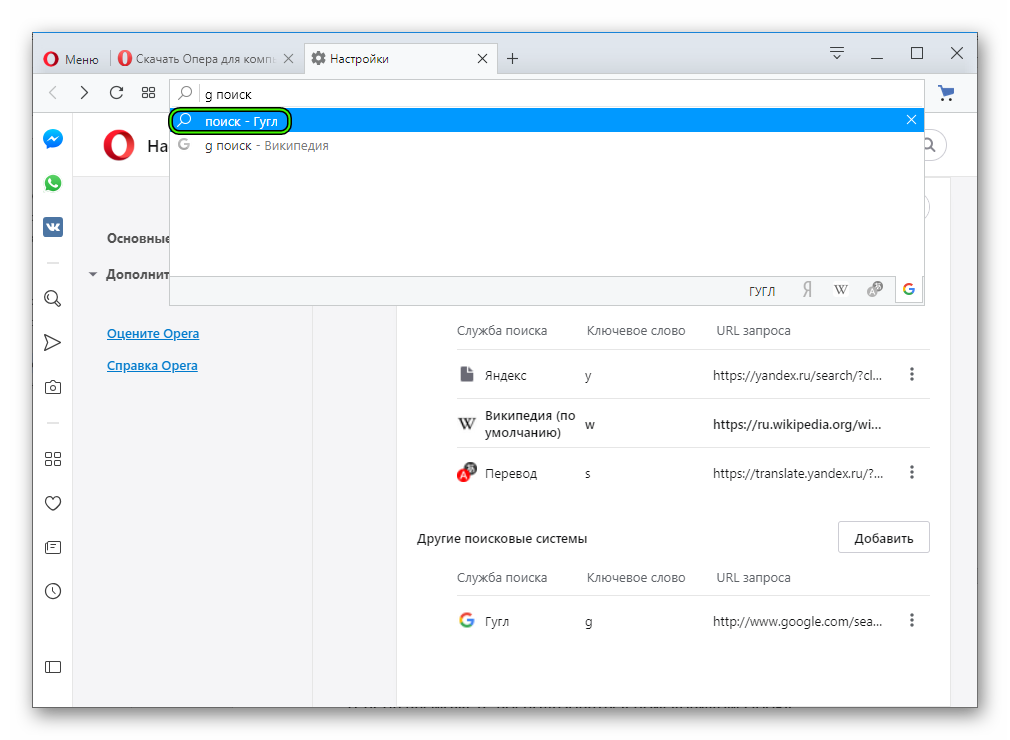 Также пользователю доступно добавление поисковой системы Google в Оперу. Делается это следующим образом: