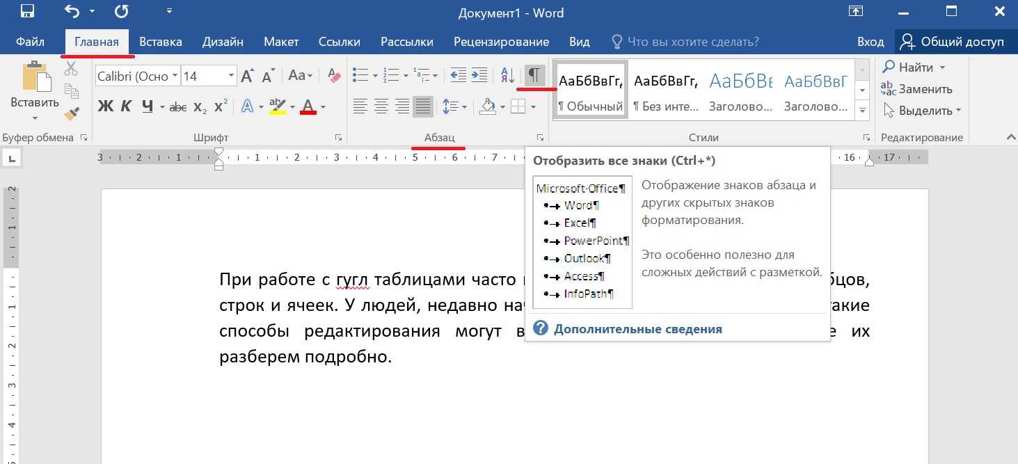 1. Нажмите соответствующий значок («¶»)на верхней панели (вкладка «Главная») или используйте комбинацию клавиш «Ctrl+Shift+8».