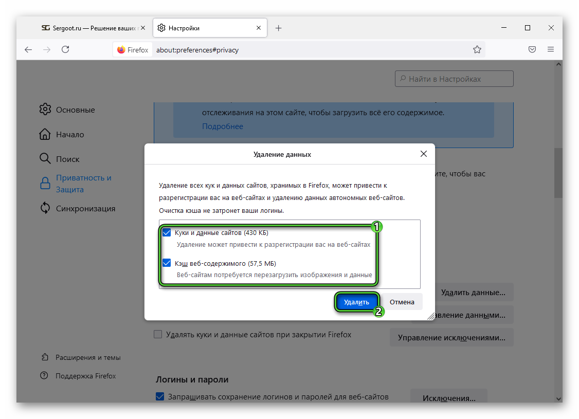 Кэш управляется из «Настроек», раздел «Приватность и защита». Допускается получить прямой доступ к разделу, набрав в адресной строке about:preferences#privacy, или пройти поопциям меню, как на иллюстрации