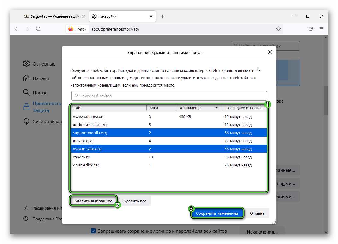 Здесь отметьте «нежелательные» сайты. Чтобы выделить несколько записей, кликайте по каждой с зажатой клавишей Ctrl на клавиатуре. Затем нажмите на кнопку «Удалить выбранное», а в конце – на «Сохранить изменения».