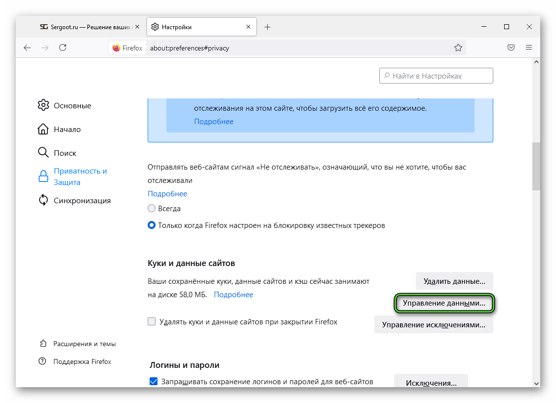 Кроме того, вы можете стереть cookie только для отдельных сайтов. Для этого воспользуйтесь опцией «Управление данными…» на той же странице.