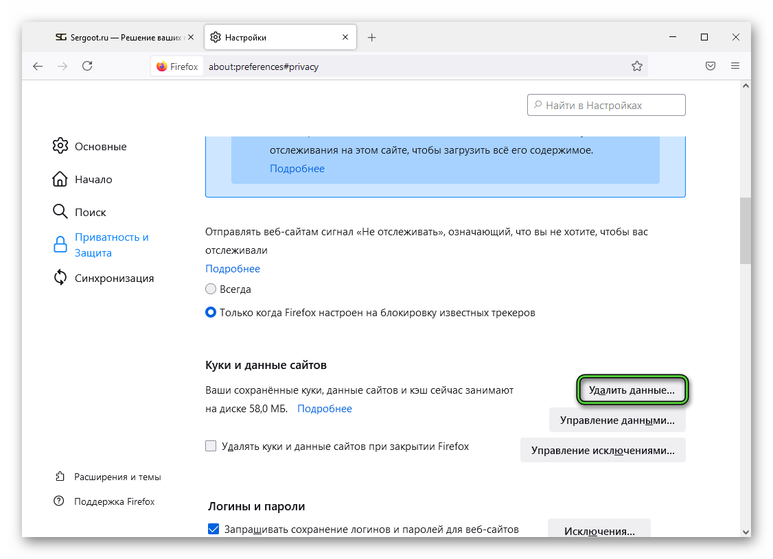Вполне возможно, что вы захотите не только отключить сохранение куки-файлов в Мозиле, но и полностью стереть их из браузера. Делается это на той же самой странице настроек, просто активируйте опцию «Удалить данные…».