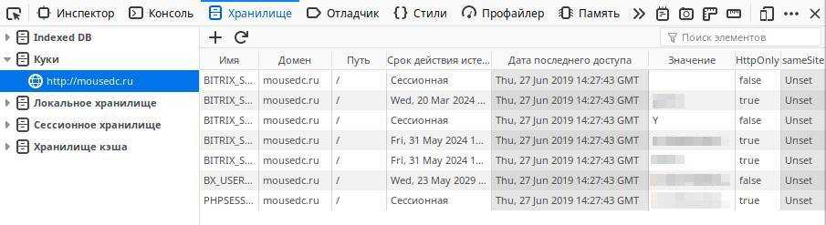 Теперь необходимо перейти в закладку «Хранилище». В ней выбрать закладку «Куки» и нужный домен, на который записывались интересующие куки.