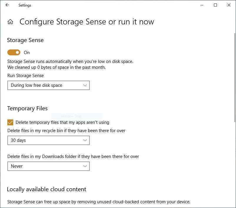 Если включить «Storage Sense» Windows будет следить за папкой «Загрузки» и удалять файлы которые не изменялись в течении месяца.